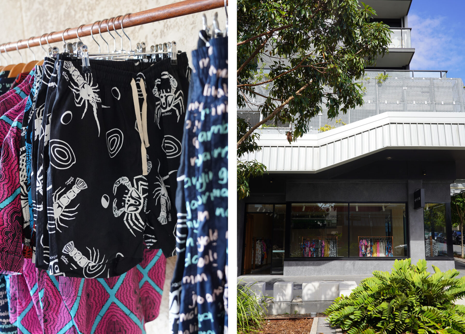 The store features beautiful warm tones and natural materials like timber and rocks sustainably sourced from construction site byproducts. The bright and bold colours of our clothing pop against the earthy feeling of the fit-out. We were privileged to be a part of the design process through our other business Blaklash, and we co-designed the flagship store with architectural design practice Hogg and Lamb. It was generously supported by Lendlease. We commissioned Lardil man Gareth Robertson, of Blackwood Collective, to craft a four-metre artisan table for the centre of the store – a place where one can sit down, have a cuppa and a yarn. With each garment telling a story, there is a lot to share at the table. From this centrepiece, the rest of the store flows.