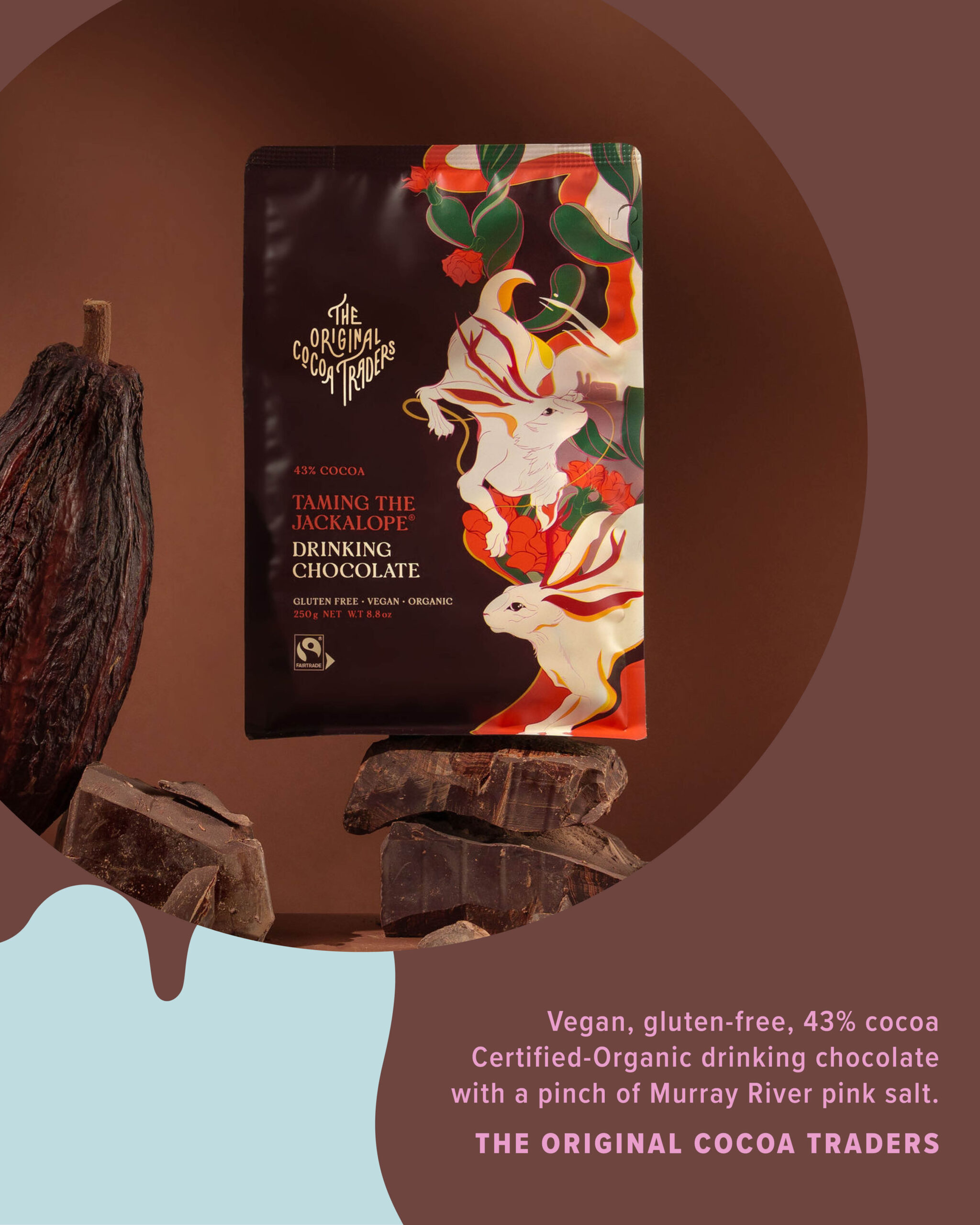 - Vegan, gluten-free, 43% cocoa Certified-Organic Taming The Jackalope Drinking Chocolate with a pinch of Murray River pink salt (250gm) from The Original Cocoa Traders.