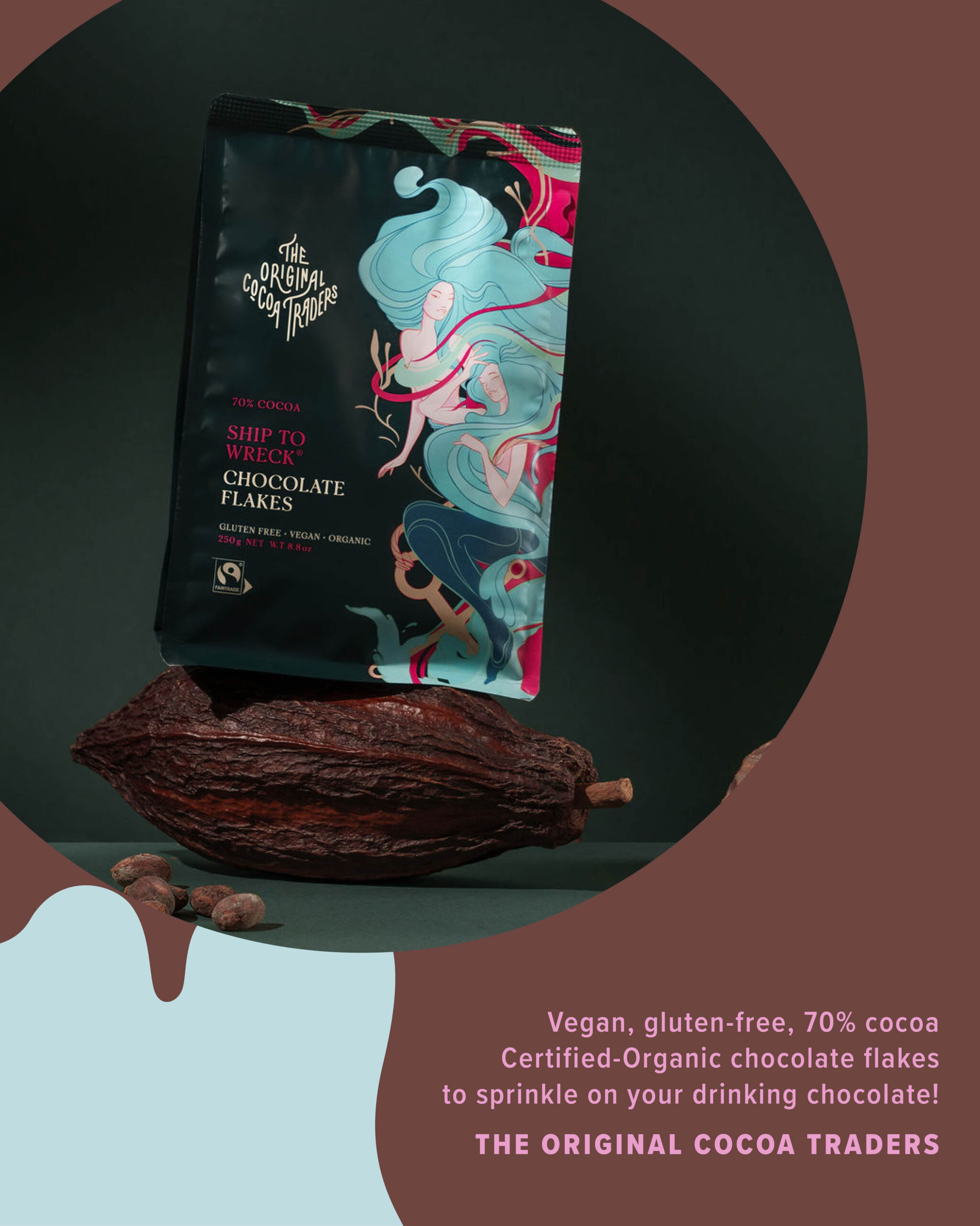 Vegan, gluten-free, 70% cocoa Certified-Organic Ship To Wreck Chocolate Flakes (250gm) to sprinkle on your drinking chocolate, from The Original Cocoa Traders.