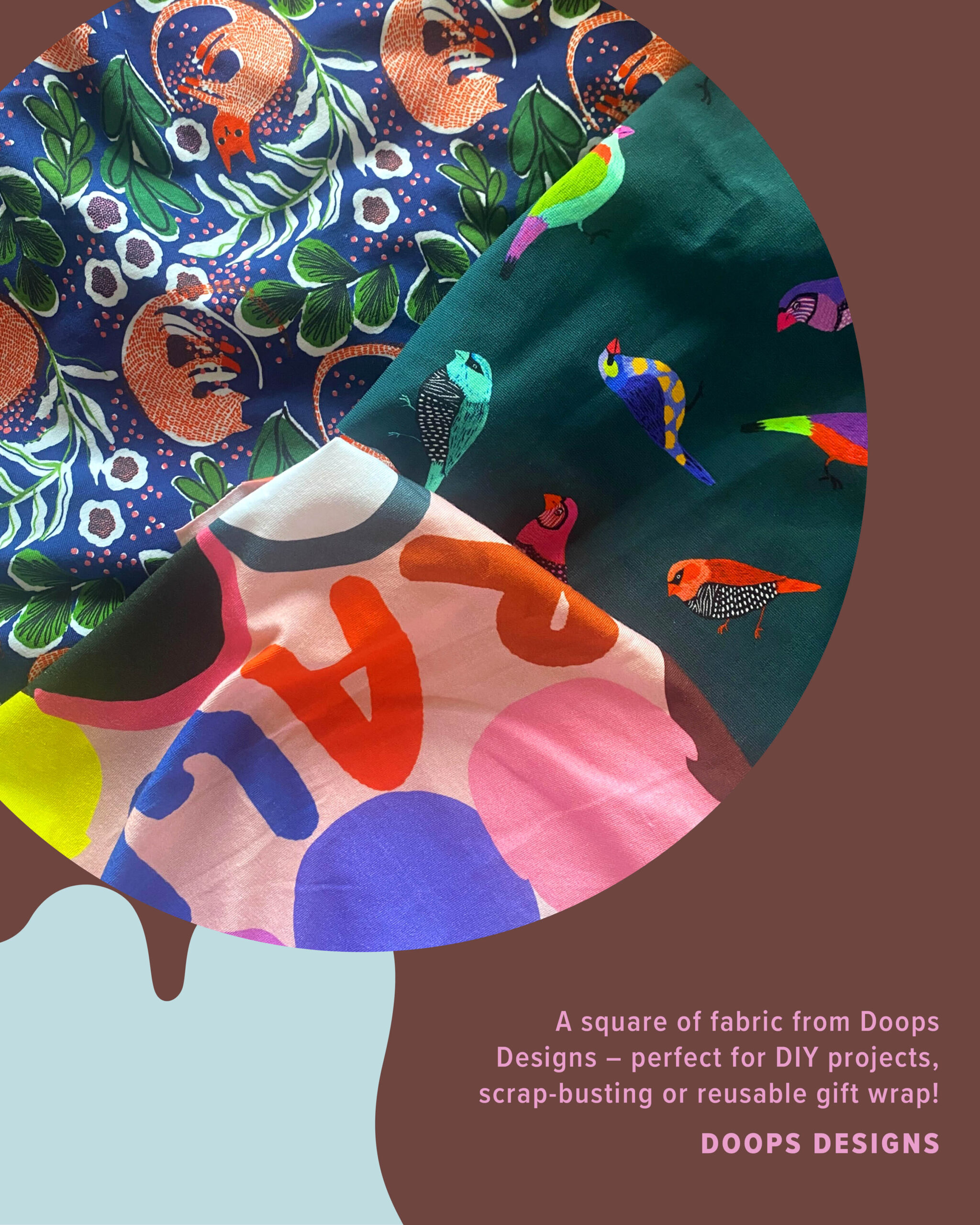 - This bundle comes wrapped in a square of fabric from Doops Designs – perfect for DIY projects, scrap-busting or reusable gift wrap!