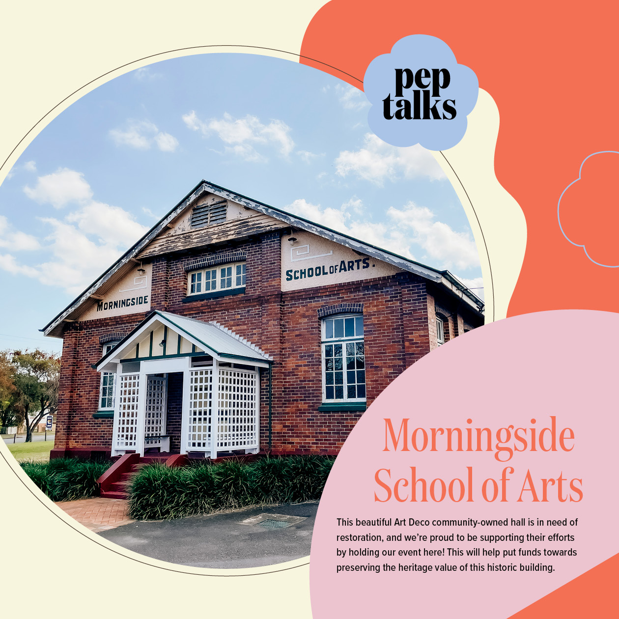 Morningside School of Arts, Morningside, 4170 Brisbane. This beautiful Art Deco community-owned hall is in need of restoration, and we’re proud to be supporting their efforts by holding our event here! This will help put funds towards preserving the heritage value of this historic building.